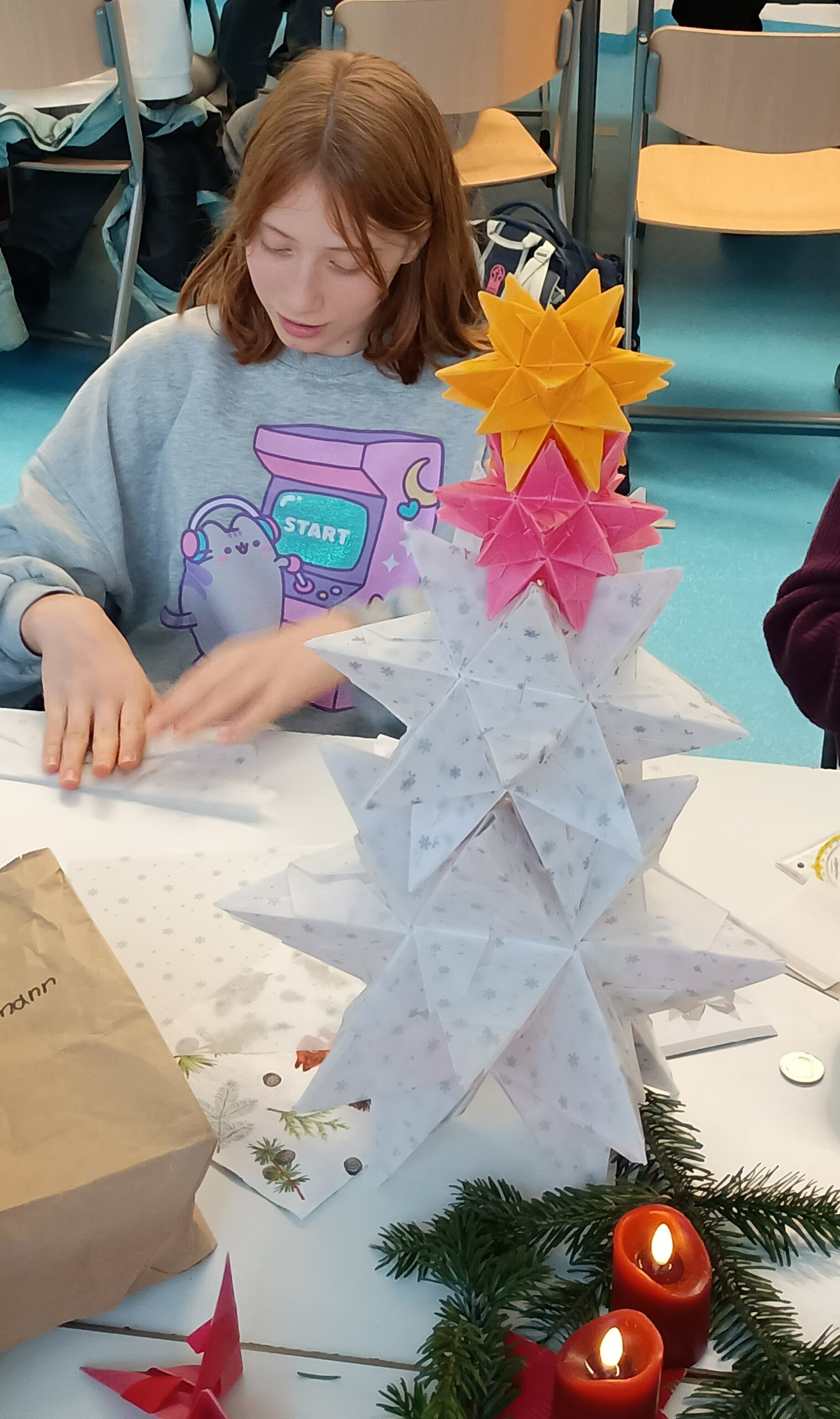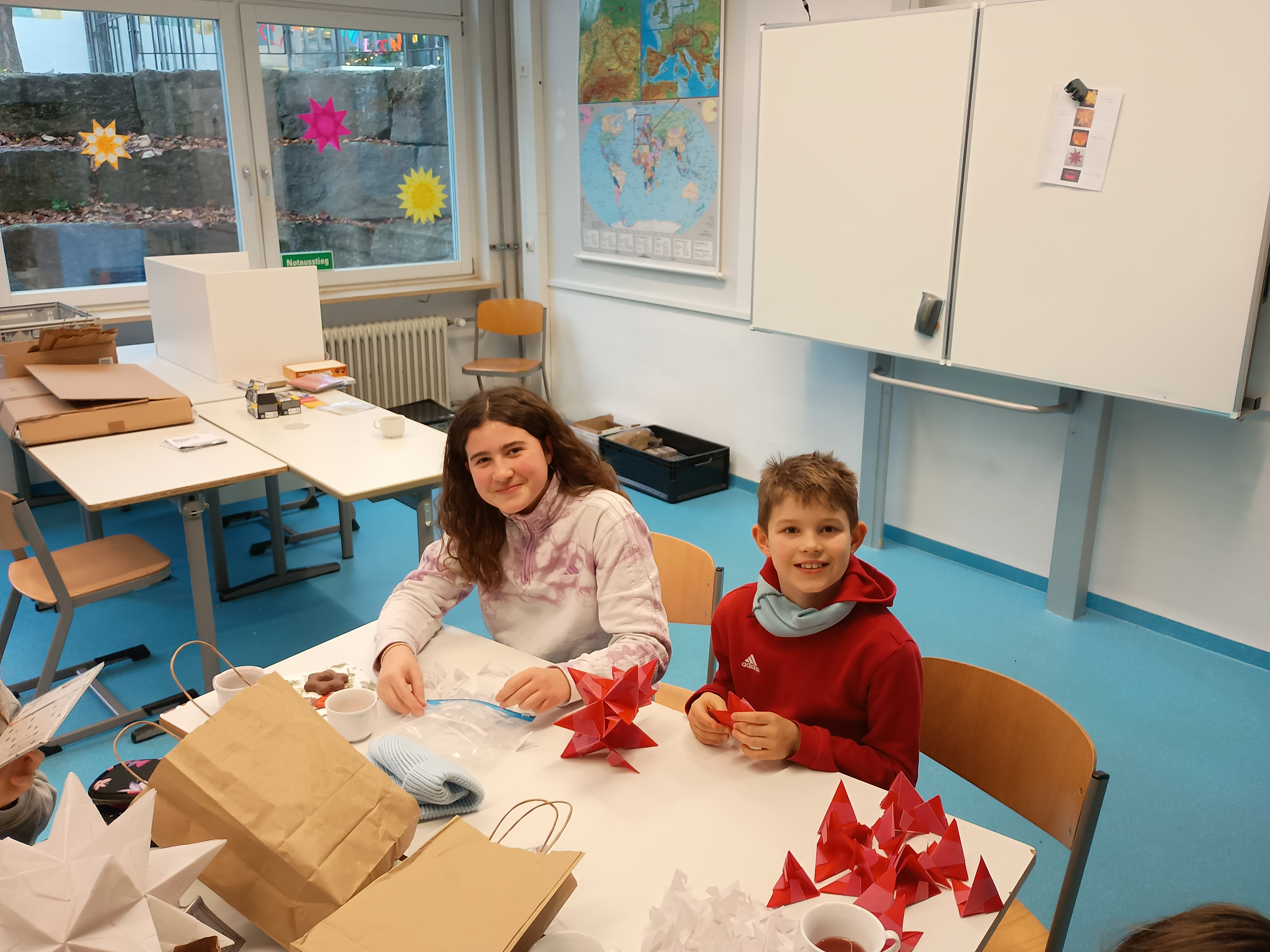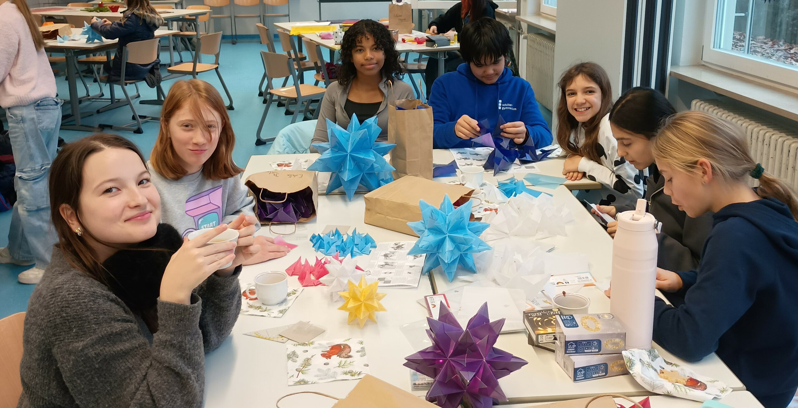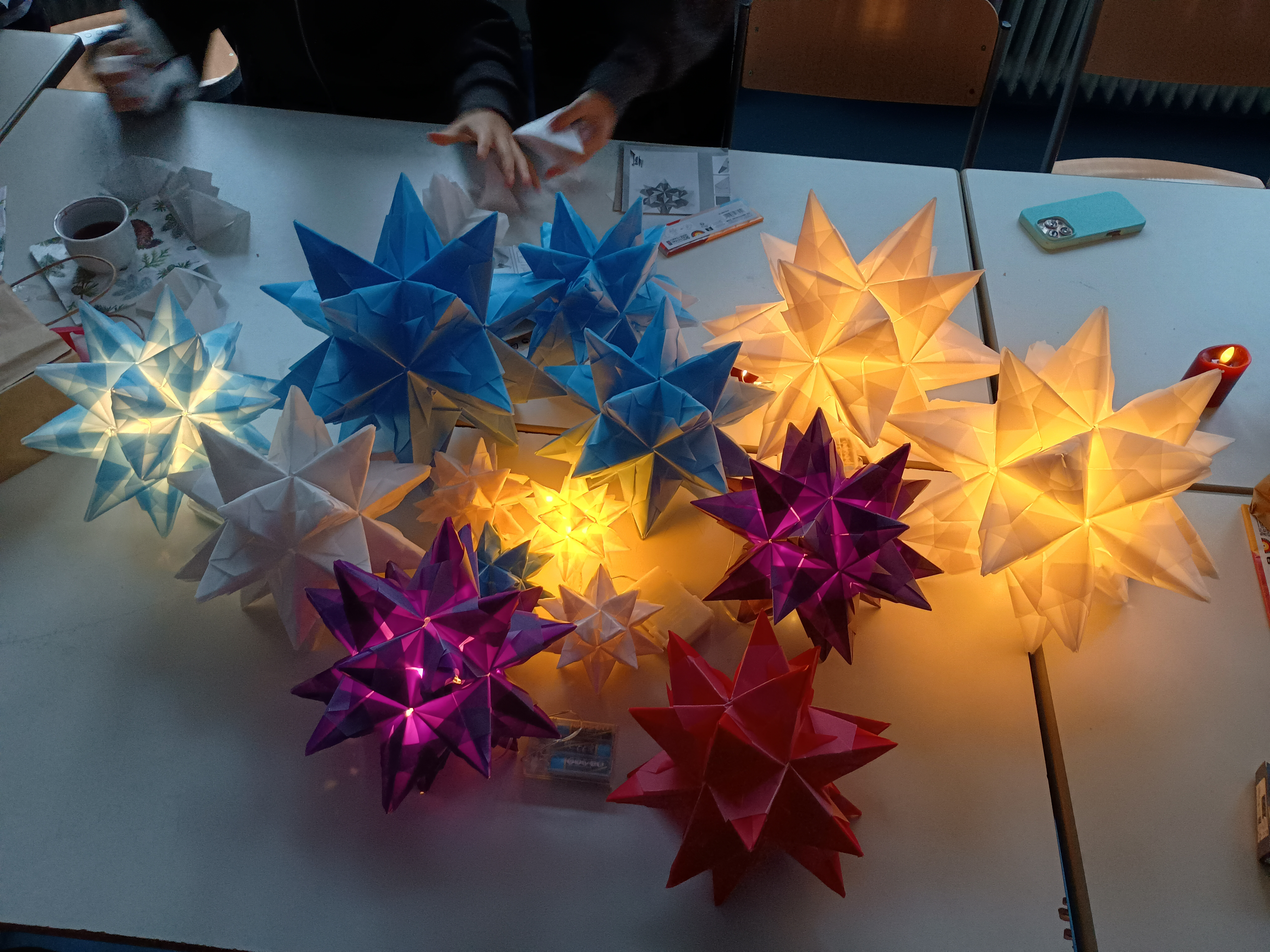 An vier Nachmittagen in der Vorweihnachtszeit hatten interessierte und fingerfertige Schülerinnen und Schüler die Möglichkeit, wunderschöne und anspruchsvolle Weihnachtsmotive zu basteln. Möglich gemacht hat diese AG Frau Gabriele Schuler, die bereits seit einigen Jahren die "Sternstunden" anbietet. Die Ergebnisse können sich sehen lassen. Vielen Dank, Frau Schuler, für Ihren Einsatz!